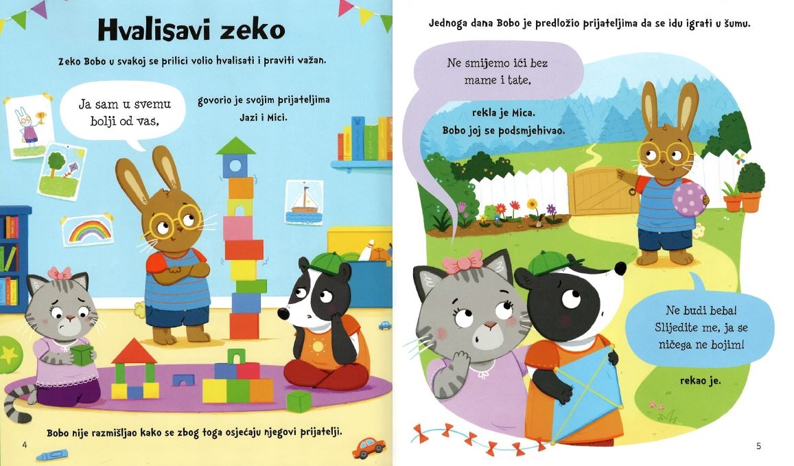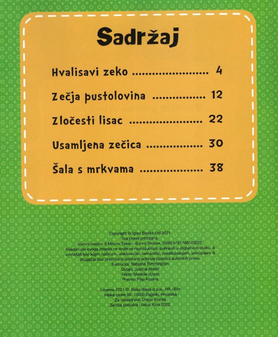 Svaka od ovih pet kratkih i zabavnih priča sadrži zanimljivu poruku. Upoznajte zeku hvalisavca, saznajte kako se zečevi rješavaju zločestoga lisca te tko to zbija neslane šale na jednoj farmi. Zečje priče razveselit će mališane željne čitanja!