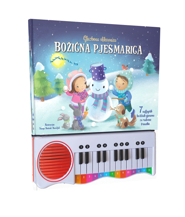 Zasviraj 7 poznatih božićnih pjesama na klavijaturama! Uz ovu će slikovnicu najmlađi upoznati radost stvaranja glazbe i osjetiti božićni duh! Na svakoj ćete stranici pronaći novu pjesmu koja će ispuniti vaš dom toplinom osmijesima za najljepše dane u godini. Numerirani kružići u boji odgovaraju tonovima melodije da dijete može naučiti svirati poznate pjesme.   UPOZORENJE: Ova slikovnica sadrži baterije i elektroniku. U njima su tvari koje mogu naštetiti okolišu. Ne bacajte ih s ostalim kućnim otpadom, nego ih odložite na za to predviđenim mjestima. Baterije su malene i opasne za dječje rukovanje. Dijete se ne bi smjelo koristiti ovim proizvodom ako spremnik za baterije nije propisno osiguran. Preporučuje se korištenje uz nadzor odrasle osobe.